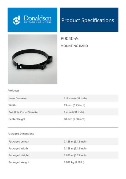 Genuine Donaldson P004055 Mounting Band is designed to provide reliable performance in mounting band applications. Built with high-quality materials, it ensures consistent functionality and durability.Ideal for industrial, automotive, or heavy-duty environments, this component enhances system performance and longevity.
