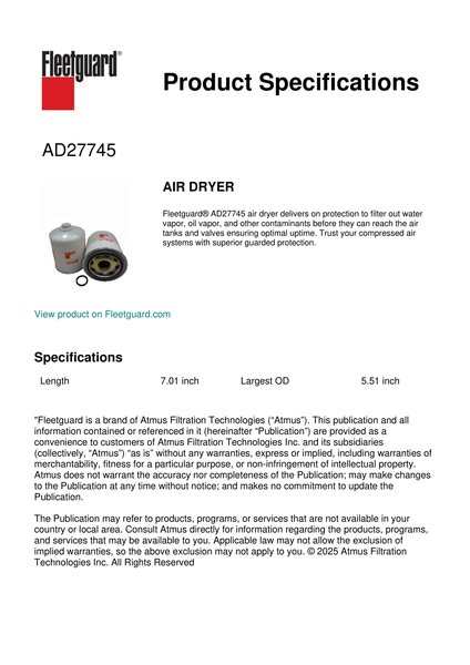 Fleetguard® AD27745 air dryer delivers on protection to filter out water vapor, oil vapor, and other contaminants before they can reach the air tanks and valves ensuring optimal uptime. Trust your compressed air systems with superior guarded protection.Specification