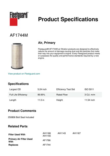 Fleetguard® AF1744M air filtration products are designed to effectively reduce the amount of damage-causing dust and dirt particles that make their way into your equipment’s engine. Every Fleetguard product meets or surpasses the quality and performance standards required by a new engine.Specification