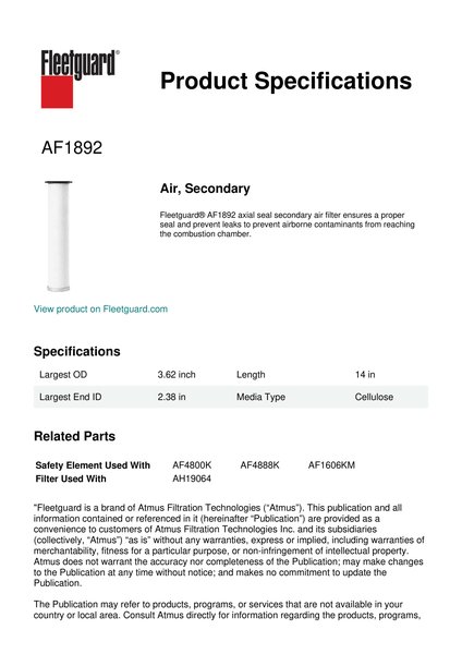 Fleetguard AF1892 Replacement Air, Secondary
