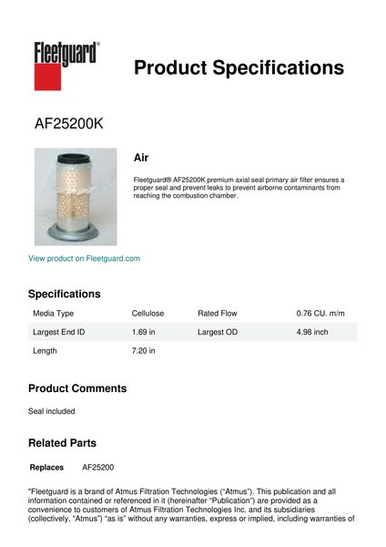 Fleetguard® AF25200K premium axial seal primary air filter ensures a proper seal and prevent leaks to prevent airborne contaminants from reaching the combustion chamber.