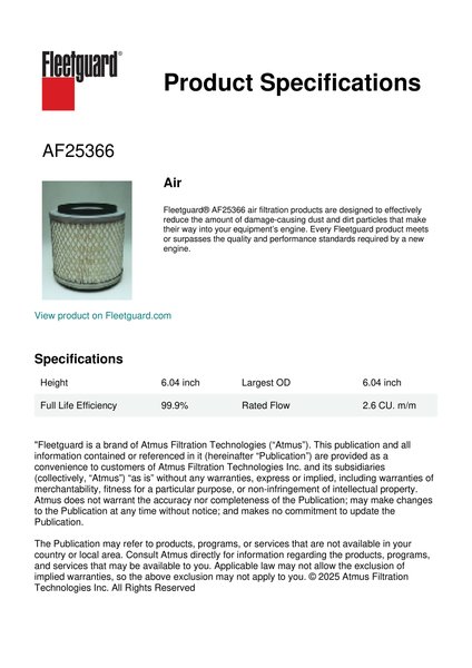Fleetguard® AF25366 air filtration products are designed to effectively reduce the amount of damage-causing dust and dirt particles that make their way into your equipment’s engine. Every Fleetguard product meets or surpasses the quality and performance standards required by a new engine.Specification