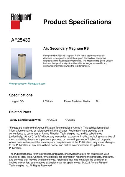 Fleetguard® AF25439 Magnum RS™ radial seal secondary air elements is designed to meet the rugged demands of equipment operating in the harshest environments. The Magnum RS offers unique features that provide significant benefits for longer service life and optimum performance when the job demands it.