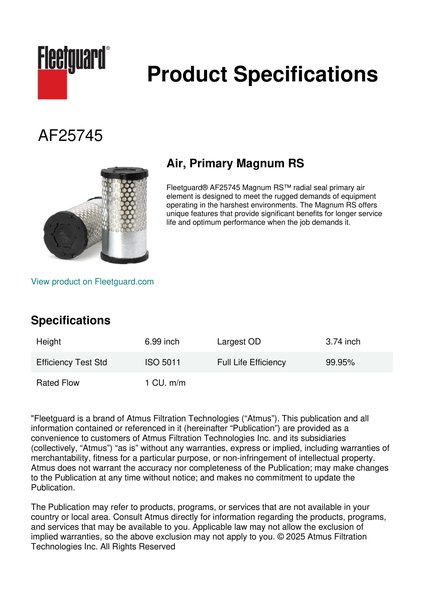 Fleetguard® AF25745 Magnum RS™ radial seal primary air element is designed to meet the rugged demands of equipment operating in the harshest environments. The Magnum RS offers unique features that provide significant benefits for longer service life and optimum performance when the job demands it.Specification