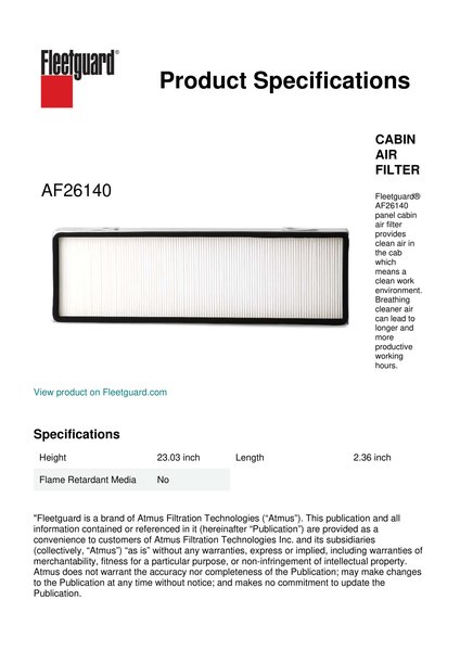 Fleetguard® AF26140 panel cabin air filter provides clean air in the cab which means a clean work environment. Breathing cleaner air can lead to longer and more productive working hours.Specification