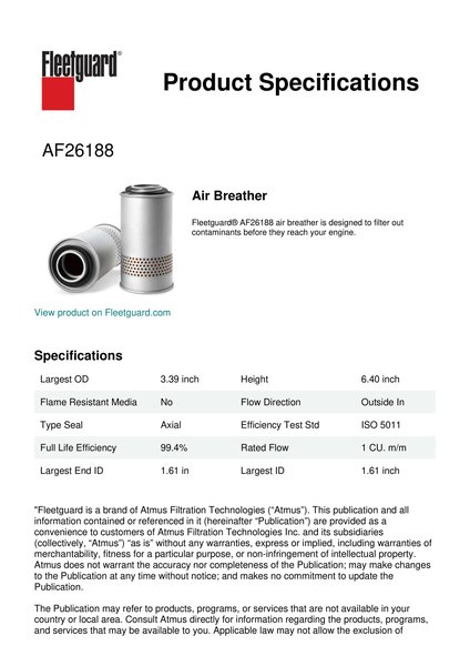 Fleetguard® AF26188 air breather is designed to filter out contaminants before they reach your engine.Specification