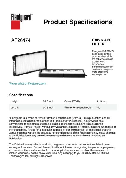 Fleetguard® AF26474 panel cabin air filter provides clean air in the cab which means a clean work environment. Breathing cleaner air can lead to longer and more productive working hours.Specification