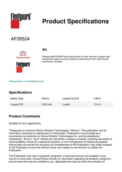 Fleetguard® AF26524 axial seal primary air filter ensures a proper seal and prevent leaks to prevent airborne contaminants from reaching the combustion chamber.Specification
