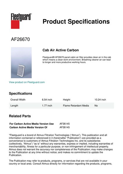 Fleetguard® AF26670 panel cabin air filter provides clean air in the cab which means a clean work environment. Breathing cleaner air can lead to longer and more productive working hours.Specification