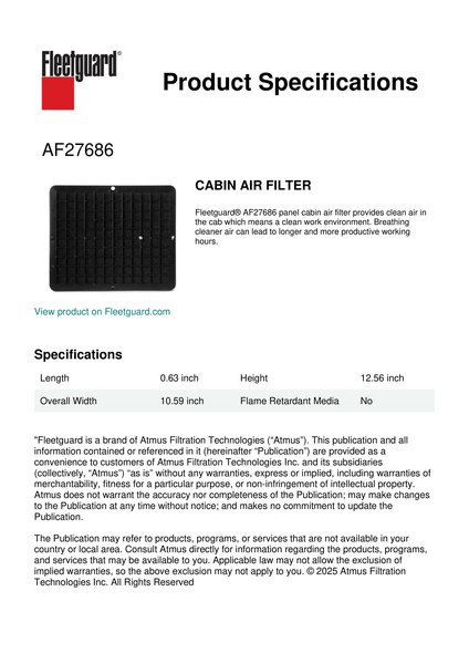 Fleetguard® AF27686 panel cabin air filter provides clean air in the cab which means a clean work environment. Breathing cleaner air can lead to longer and more productive working hours.Specification
