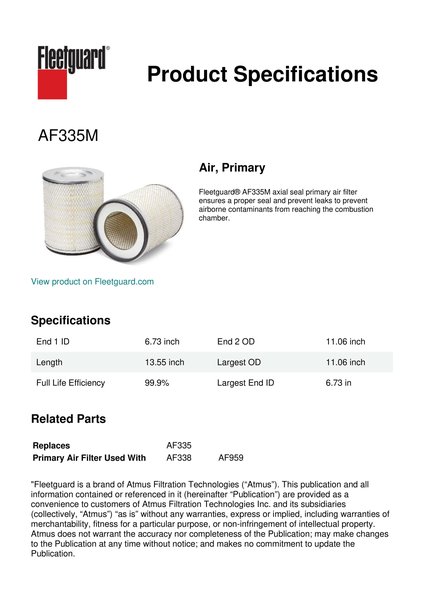 Fleetguard® AF335M axial seal primary air filter ensures a proper seal and prevent leaks to prevent airborne contaminants from reaching the combustion chamber.