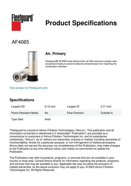 Fleetguard® AF4065 axial seal primary air filter ensures a proper seal and prevent leaks to prevent airborne contaminants from reaching the combustion chamber.
