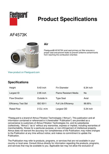 Fleetguard® AF4573K axial seal primary air filter ensures a proper seal and prevent leaks to prevent airborne contaminants from reaching the combustion chamber.