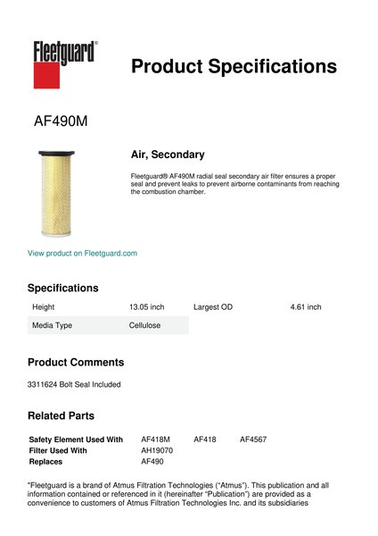 Fleetguard® AF490M radial seal secondary air filter ensures a proper seal and prevent leaks to prevent airborne contaminants from reaching the combustion chamber.
