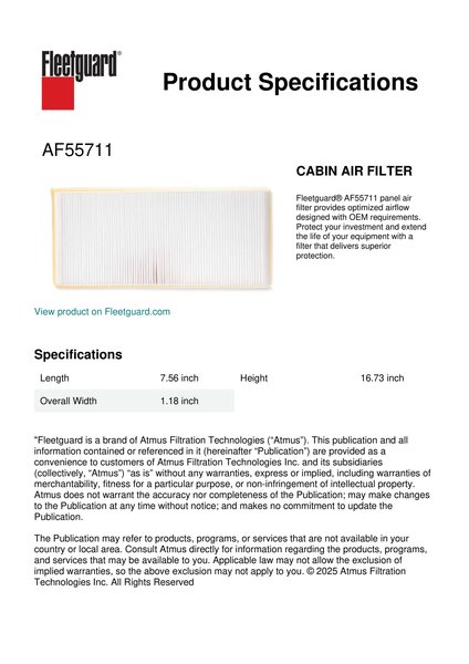 Fleetguard® AF55711 panel air filter provides optimized airflow designed with OEM requirements. Protect your investment and extend the life of your equipment with a filter that delivers superior protection.Specification