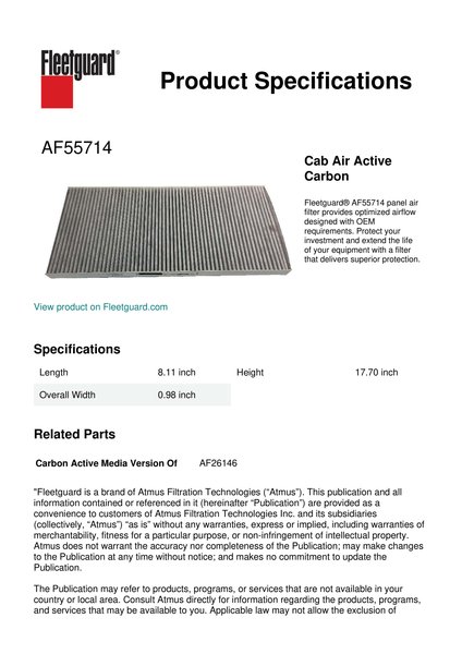 Fleetguard® AF55714 panel air filter provides optimized airflow designed with OEM requirements. Protect your investment and extend the life of your equipment with a filter that delivers superior protection.Specification