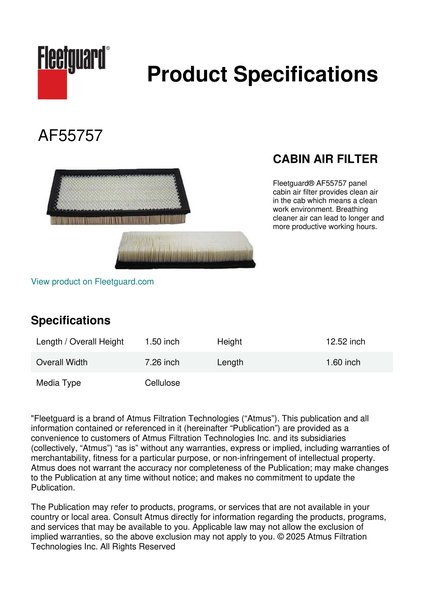 Fleetguard® AF55757 panel cabin air filter provides clean air in the cab which means a clean work environment. Breathing cleaner air can lead to longer and more productive working hours.Specification