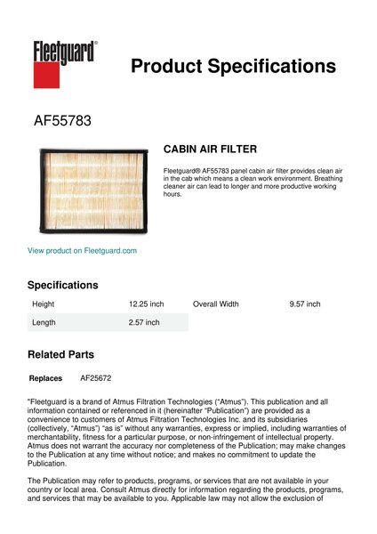 Fleetguard® AF55783 panel cabin air filter provides clean air in the cab which means a clean work environment. Breathing cleaner air can lead to longer and more productive working hours.Specification