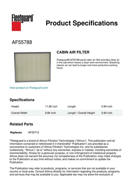 Fleetguard® AF55788 panel cabin air filter provides clean air in the cab which means a clean work environment. Breathing cleaner air can lead to longer and more productive working hours.Specification