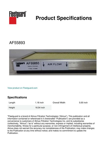 Fleetguard® AF55893 panel cabin air filter provides clean air in the cab which means a clean work environment. Breathing cleaner air can lead to longer and more productive working hours.Specification