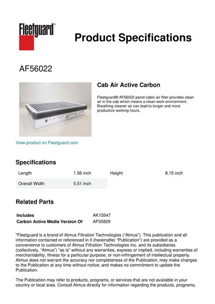 Fleetguard® AF56022 panel cabin air filter provides clean air in the cab which means a clean work environment. Breathing cleaner air can lead to longer and more productive working hours.Specification