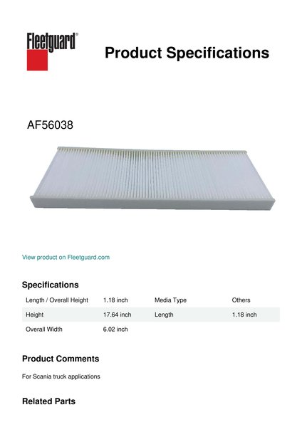 Fleetguard® AF56038 panel cabin air filter provides clean air in the cab which means a clean work environment. Breathing cleaner air can lead to longer and more productive working hours.Specification