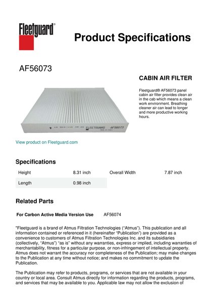 Fleetguard® AF56073 panel cabin air filter provides clean air in the cab which means a clean work environment. Breathing cleaner air can lead to longer and more productive working hours.Specification