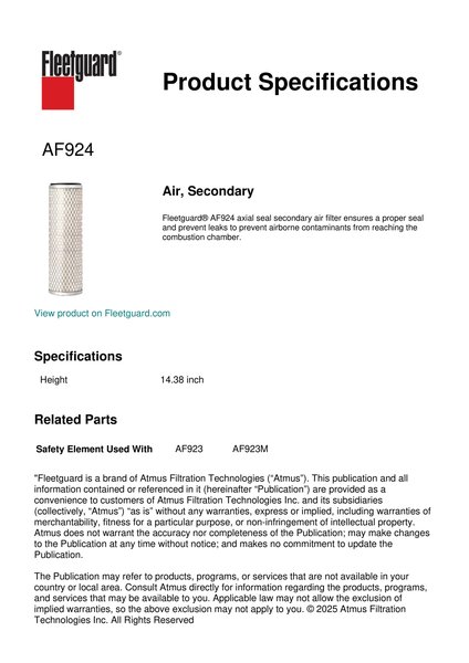 Fleetguard® AF924 axial seal secondary air filter ensures a proper seal and prevent leaks to prevent airborne contaminants from reaching the combustion chamber.