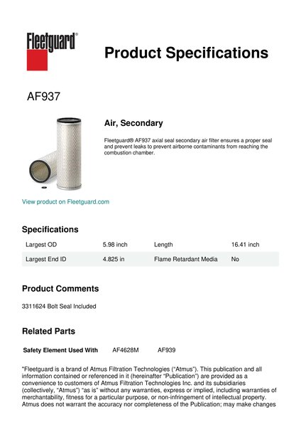 Fleetguard AF937 Air, Secondary