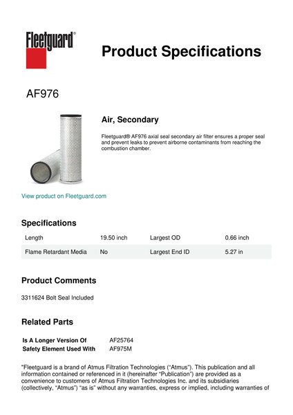 Fleetguard AF976 Replacement Air, Secondary
