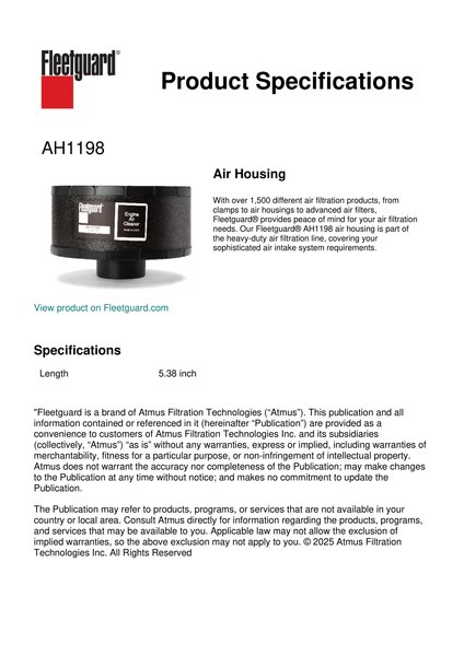With over 1,500 different air filtration products, from clamps to air housings to advanced air filters, Fleetguard® provides peace of mind for your air filtration needs. Our Fleetguard® AH1198 air housing is part of the heavy-duty air filtration line, covering your sophisticated air intake system requirements.Specification