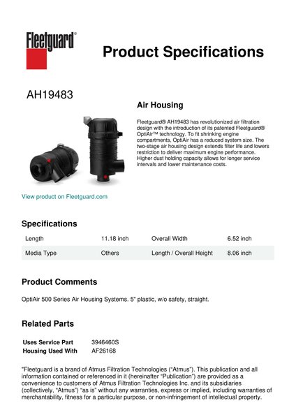 Fleetguard® AH19483 has revolutionized air filtration design with the introduction of its patented Fleetguard® OptiAir™ technology. To fit shrinking engine compartments, OptiAir has a reduced system size. The two-stage air housing design extends filter life and lowers restriction to deliver maximum engine performance. Higher dust holding capacity allows for longer service intervals and lower maintenance costs.Specification