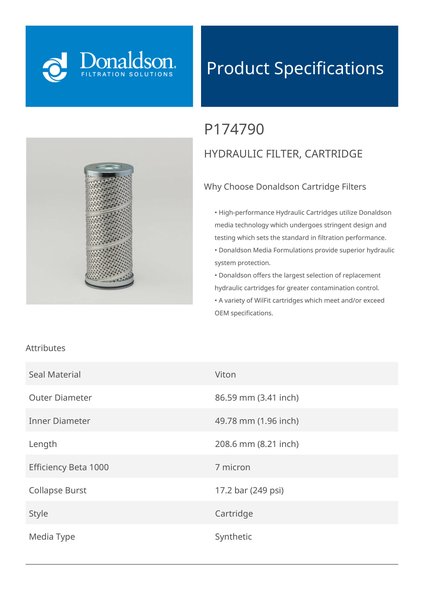 Genuine Donaldson P174790 Hydraulic Filter, Cartridge is designed to provide superior protection for your hydraulic system, effectively capturing contaminants to ensure clean fluid circulation. With high-quality filtration media, it extends equipment life, improves operational efficiency, and maintains fluid cleanliness even in the most demanding environments.