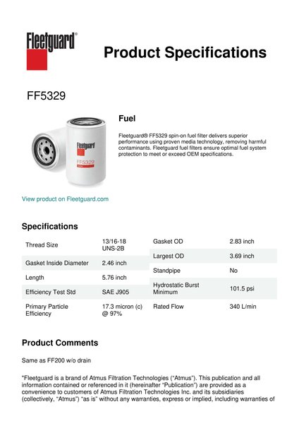 Fleetguard® FF5329 spin-on fuel filter delivers superior performance using proven media technology, removing harmful contaminants. Fleetguard fuel filters ensure optimal fuel system protection to meet or exceed OEM specifications.Specification