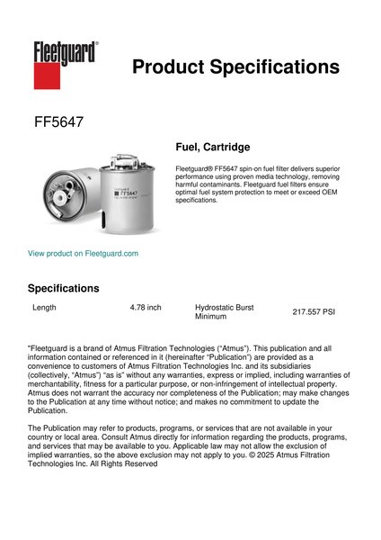 Fleetguard® FF5647 spin-on fuel filter delivers superior performance using proven media technology, removing harmful contaminants. Fleetguard fuel filters ensure optimal fuel system protection to meet or exceed OEM specifications.Specification