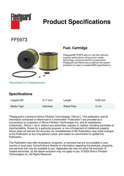 Fleetguard® FF5973 spin-on fuel filter delivers superior performance using proven media technology, removing harmful contaminants. Fleetguard fuel filters ensure optimal fuel system protection to meet or exceed OEM specifications.