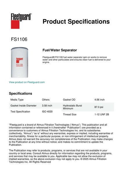 Fleetguard® FS1106 fuel water separator spin-on works to remove water and other particulates and ensures clean fuel is delivered to your engine.Specification