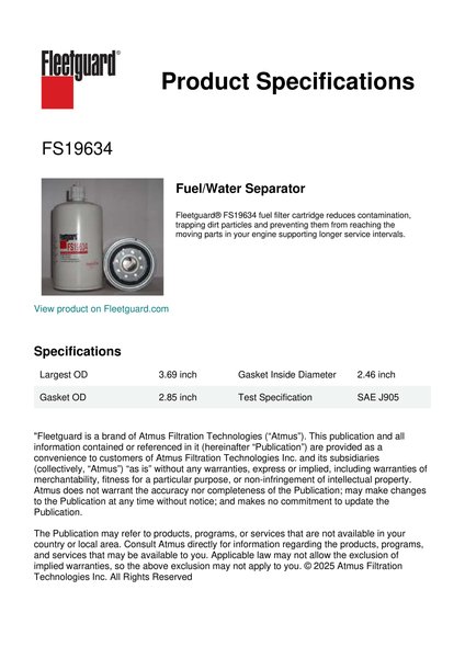 Fleetguard® FS19634 fuel filter cartridge reduces contamination, trapping dirt particles and preventing them from reaching the moving parts in your engine supporting longer service intervals.Specification