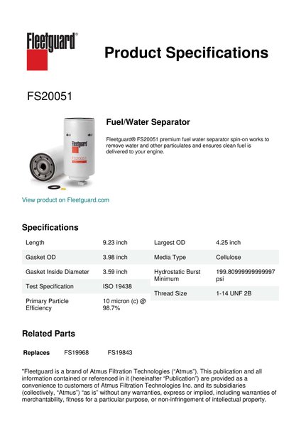 Fleetguard® FS20051 premium fuel water separator spin-on works to remove water and other particulates and ensures clean fuel is delivered to your engine.Specification
