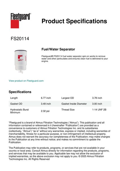 Fleetguard® FS20114 fuel water separator spin-on works to remove water and other particulates and ensures clean fuel is delivered to your engine.Specification