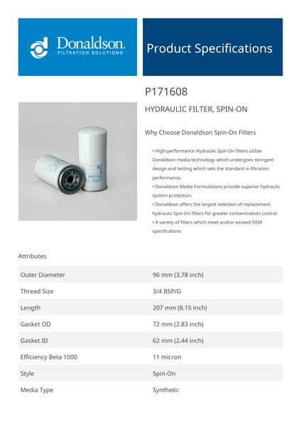 Genuine Donaldson P171608 Hydraulic Filter, Spin-On provides dependable protection for hydraulic systems by efficiently removing particulates and contaminants. It ensures clean hydraulic fluid, promoting smooth operation and extending the lifespan of critical system components.With its easy-to-install spin-on design, this filter minimizes downtime and maintenance costs. Its durable construction and advanced filtration media make it a trusted choice for industrial and mobile hydraulic applications requiring reliable performance.