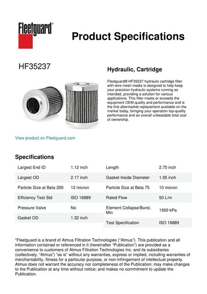 Fleetguard® HF35237 hydraulic cartridge filter with wire mesh media is designed to help keep your precision hydraulic systems running as intended, providing a solution for various applications. This filter meets or exceeds the equipment OEM quality and performance and is the first aftermarket replacement available on the market today, bringing your operation top-quality performance and an overall unbeatable total cost of ownership.Specification