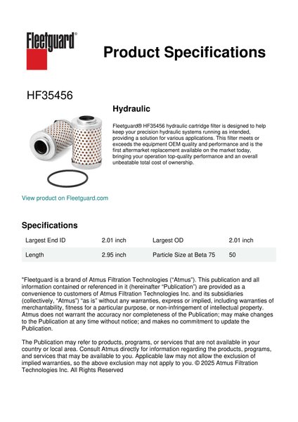 Fleetguard® HF35456 hydraulic cartridge filter is designed to help keep your precision hydraulic systems running as intended, providing a solution for various applications. This filter meets or exceeds the equipment OEM quality and performance and is the first aftermarket replacement available on the market today, bringing your operation top-quality performance and an overall unbeatable total cost of ownership.