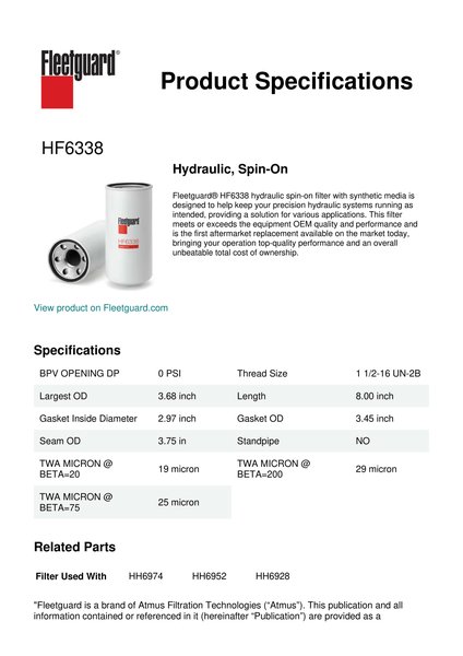 Fleetguard® HF6338 hydraulic spin-on filter with synthetic media is designed to help keep your precision hydraulic systems running as intended, providing a solution for various applications. This filter meets or exceeds the equipment OEM quality and performance and is the first aftermarket replacement available on the market today, bringing your operation top-quality performance and an overall unbeatable total cost of ownership.Specification