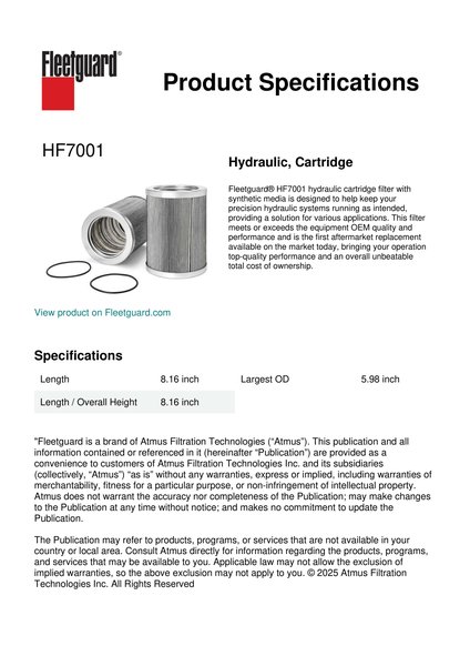 Fleetguard® HF7001 hydraulic cartridge filter with synthetic media is designed to help keep your precision hydraulic systems running as intended, providing a solution for various applications. This filter meets or exceeds the equipment OEM quality and performance and is the first aftermarket replacement available on the market today, bringing your operation top-quality performance and an overall unbeatable total cost of ownership.Specification