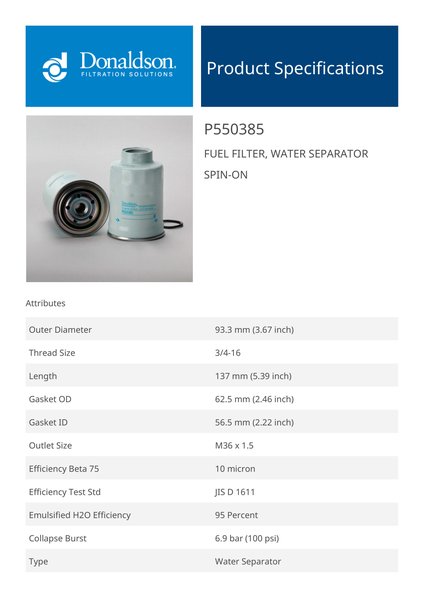 Genuine Donaldson P550385 Fuel Filter, Water Separator Spin-On is designed to remove contaminants and separate water from diesel fuel, safeguarding your engine against corrosion and injector damage. It ensures clean fuel delivery, enhancing engine efficiency and supporting reliable performance in diesel applications.