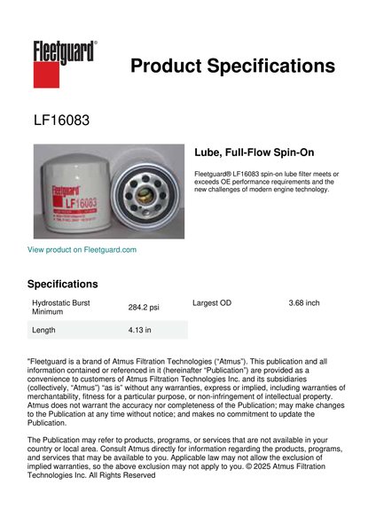 Fleetguard® LF16083 spin-on lube filter meets or exceeds OE performance requirements and the new challenges of modern engine technology.Specification