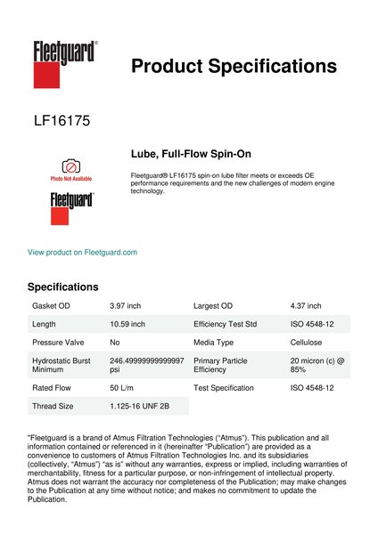 Fleetguard® LF16175 spin-on lube filter meets or exceeds OE performance requirements and the new challenges of modern engine technology.Specification