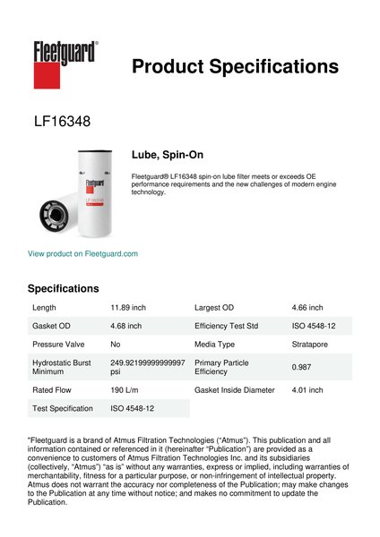 Fleetguard® LF16348 spin-on lube filter meets or exceeds OE performance requirements and the new challenges of modern engine technology.Specification