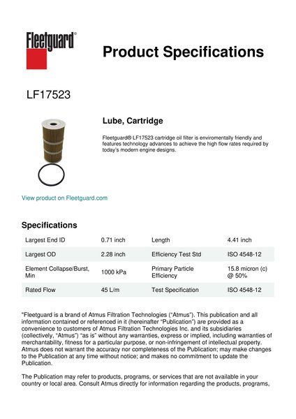 Fleetguard® LF17523 cartridge oil filter is enviromentally friendly and features technology advances to achieve the high flow rates required by today’s modern engine designs.